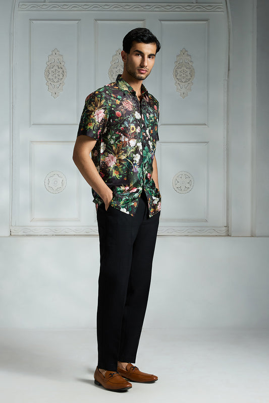 Black Floral Printed Silk Shirt